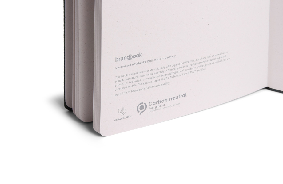 - Nachsatz aus 160 g/m² Upcycling-Papier mit Algen, brandbook Logo und CO2-Ausgleichszertifikat