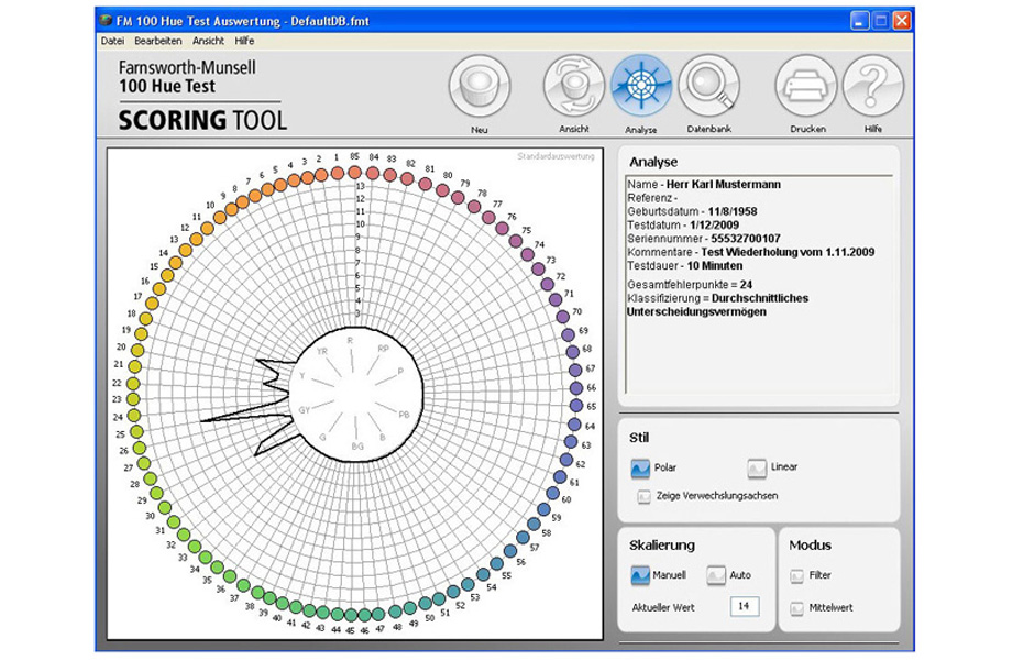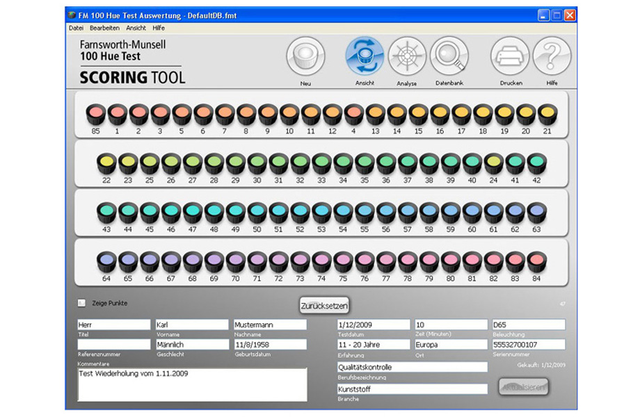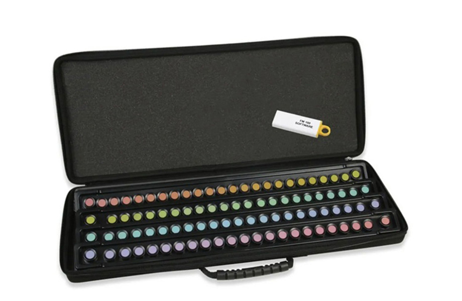 - Farnsworth-Munsell 100 Hue TestTestkoffer zur Ermittlung von Farbfehlsichtigkeiten, inkl. Software zur Auswertung und Ausdruck der Testergebnisse.85 herausnehmbare Farbkappen, die das komplette Farbspektrum erfassen.