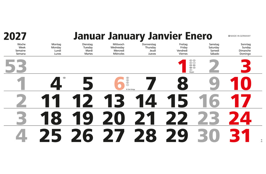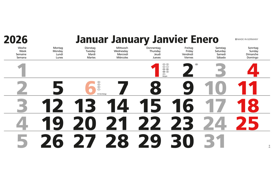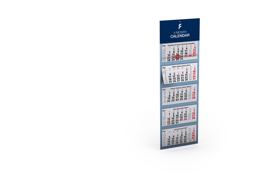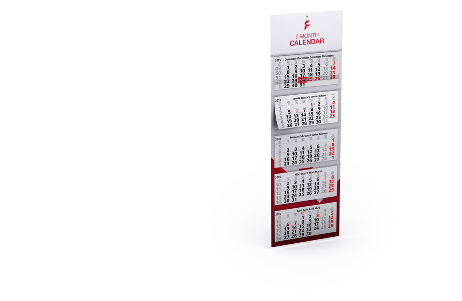 Kalenendarium: 2026, 70g Offset weiß, 2/0-farbig, vorgedruckt, Format: 33 x 98,5 cm gesamt (Kalenderblock: 5 Mal je 30 x 14 cm, Rückwand: 33 x 98,5 cm), Maße zusammengefaltet: 33 x 16,5 cm, Blattanzahl: 5 Kalenderblocks mit jeweils 12 Blatt, Rückwand: 350g Chromosulfatkarton, 4/0-farbig, individuell bedruckbar, Verarbeitung: Rückwand 5-fach gerillt, mit Aufhängeöse, Kalenderblocks perforiert und auf Rückwand verleimt, Ausstattung: mit Datumsschieber, fertig montiert, Gewicht je Stk.: ca. 300 g