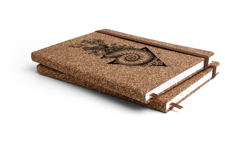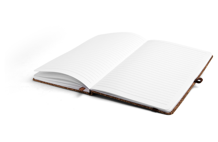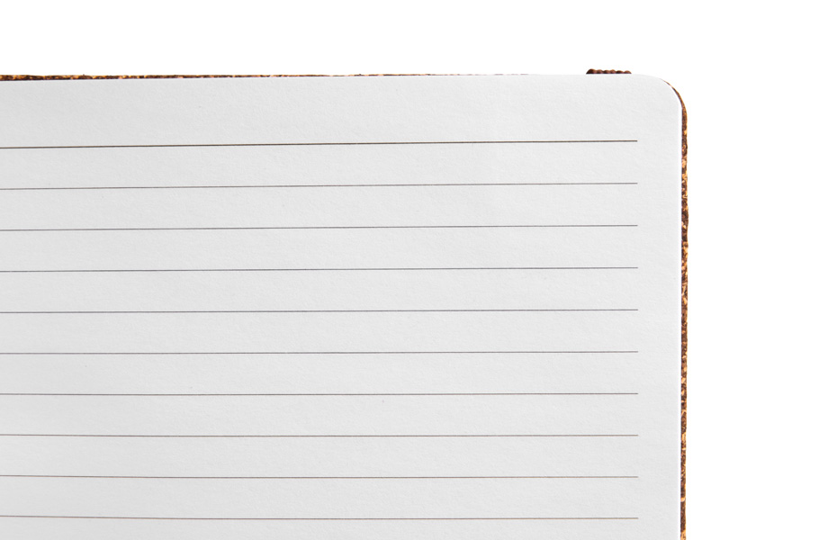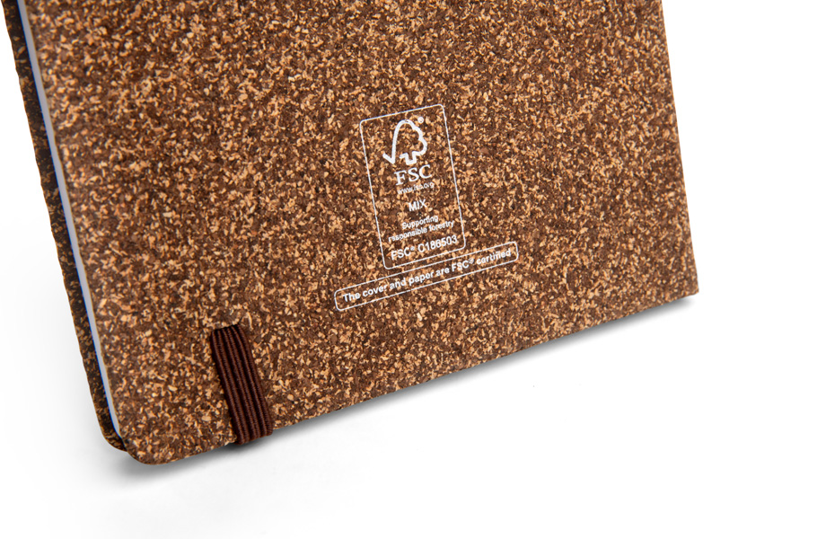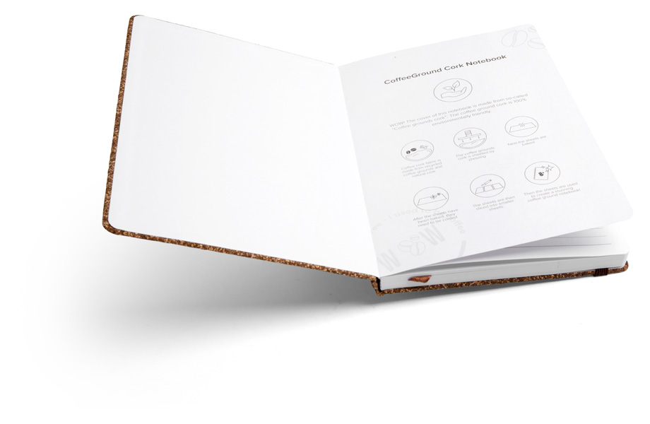 formaat: 14,4 x 21,5 cm, bedrukbaar gedeelte voorzijde: 9 x 18 cm gecentreerd in het midden, kleur: één kleur Pantone zeefdruk, kaft: omslag van karton met een mix van koffiedik, kurk, polyester en katoen (cover is 9% van het totale notitieboek. Deze 9% bestaan voor 98% van gerecyclede materialen), binnendeel: 192 pagina’s, gelinieerd, 70 g wit kringlooppapier, met balpenhouder, elastiek en leeslint in het bruin, twee afgeronde hoeken
