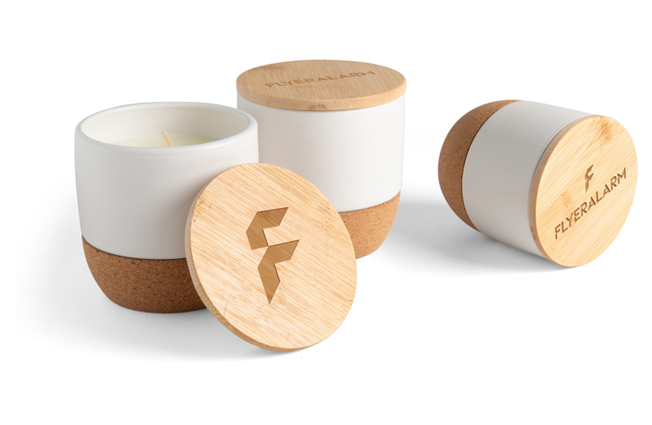 Met deze kaarsen in mokken van keramiek creëer je stijlvol sfeerlicht met een persoonlijke touch. Bovendien zijn ze dankzij de fijne en natuurlijke indruk die ze wekken prachtig in te zetten in elke inrichting. De individuele lasergravure op de bamboe deksel maakt van de kaarsen een echt hoogwaardig cadeau dat je doelgroep nog lang bij zal blijven, vooral in branches waarin het allemaal draait om stijl, emotie en zintuiglijke beleving.