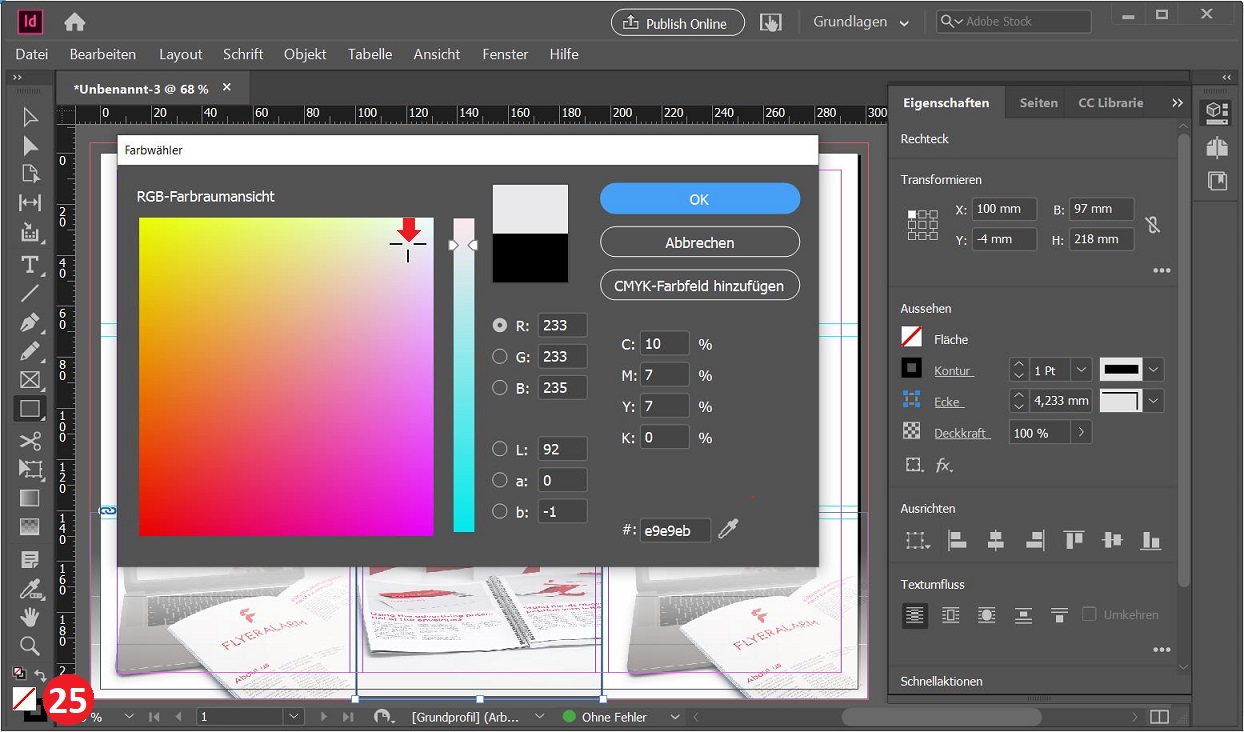 25. Om een geschikte achtergrondkleur voor uw brochure te krijgen, tekent u een rechthoek in de middelste kolom in kolombreedte. Dubbelklik op het kleurveld in de linker werkbalk om een kleurenselector weer te geven. Selecteer het pipet binnen de kleurenselector. Klik met ingedrukte muisknop op een gewenst beeldgebied van een van uw foto’s om een achtergrondkleur op te pikken.