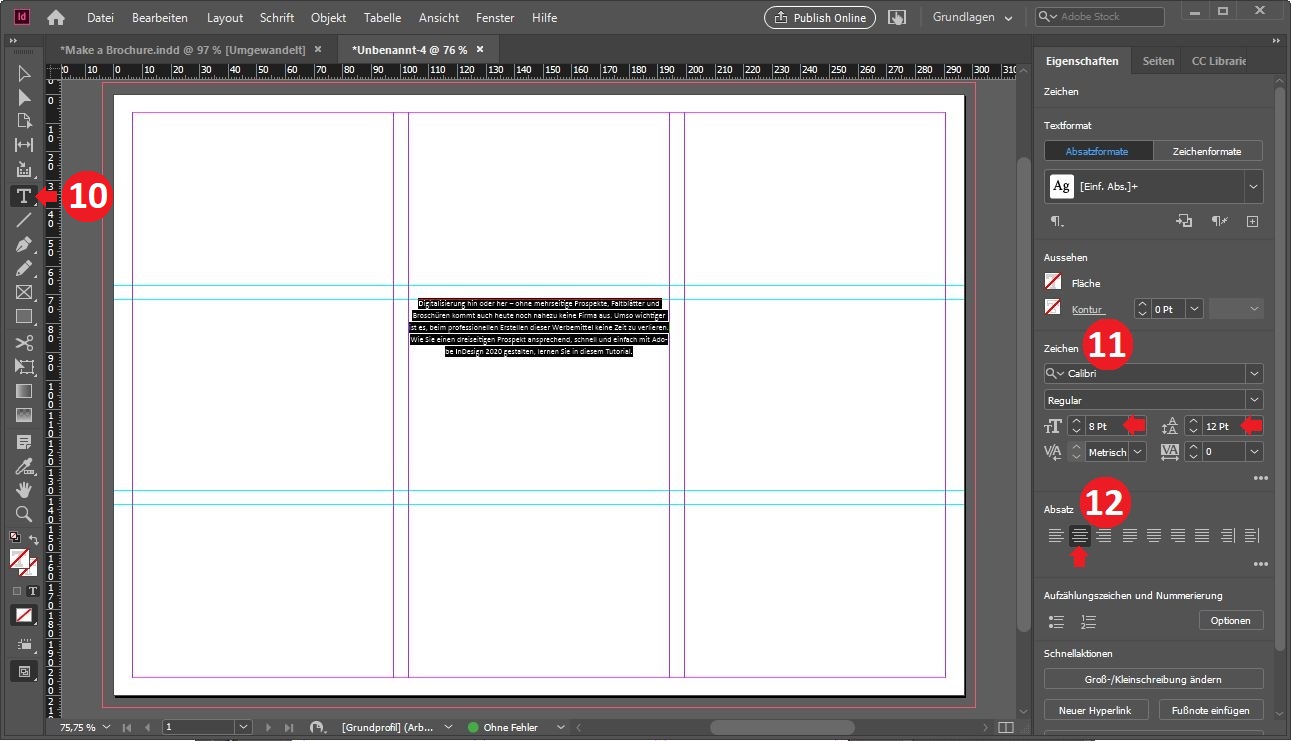 11. Voer jouw tekst in, of kopieer deze uit een ander dokument. Schakel dan over naar het bedieningspaneel aan de rechterkant. Selecteer jouw tekst en stel het gewenste lettertype in in het gedeelte tekenen van het tabblad eigenschappen. Definieer in dezelfde sectie de lettergrootte 8 pt en de regelafstand 12 pt.