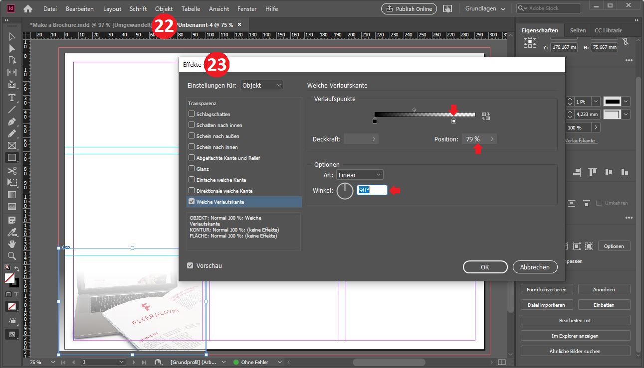 23. definieer een hoek van 90° in het dialoogvenster Effecten. Klik vervolgens op de witte schuifregelaar in de balk met het verlooppunt en voer 79% in het veld Positie in. Om uw instellingen aan te vinken, selecteert u het selectievakje Preview in de linkerbenedenhoek van het venster. Wanneer u tevreden bent met het resultaat, bevestigt u uw invoer door op OK te klikken.