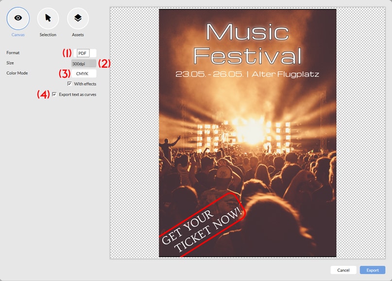 Haben Sie Ihr Layout abgeschlossen, gilt es dieses für den Druck optimiert zu exportieren. Klicken Sie dazu im Menü auf File > Export > Export. Wählen Sie bei „Format“ „PDF“ aus (1), geben Sie bei „Size“ „300dpi“ ein (2) und wählen Sie bei „Color Mode“ „CMYK“ (3). Setzen Sie unbedingt das Häkchen bei „Export text as curves“ (4), damit alle Schriften in Pfade umgewandelt werden und es später nicht zu Problemen beim Druck kommen kann.