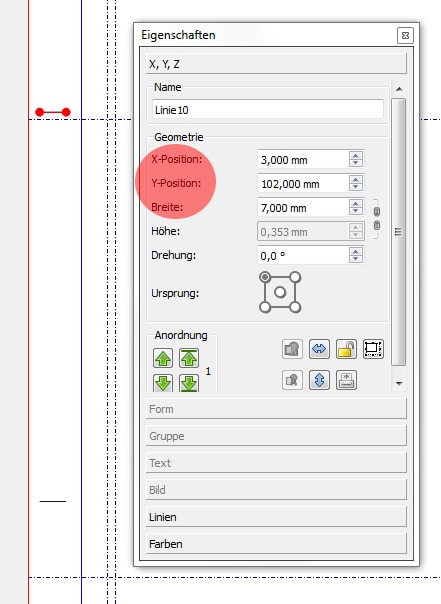 - Bestimmen Sie die genaue Position und Breite im Eigenschaften-Fenster: Y-Position 102 mm bzw. 205 mm, X-Position 3 mm, Breite 7 mm.