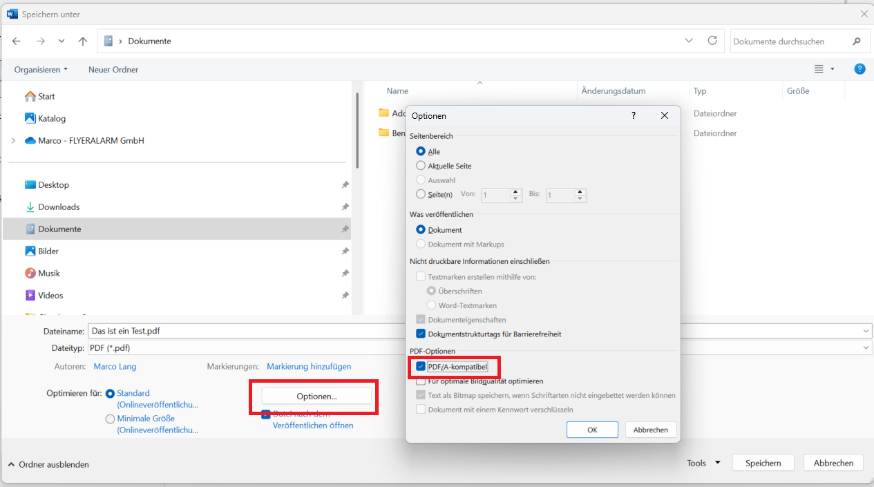 • setzen Sie einen Haken bei der Option „PDF/A-kompatible Datei erstellen“.