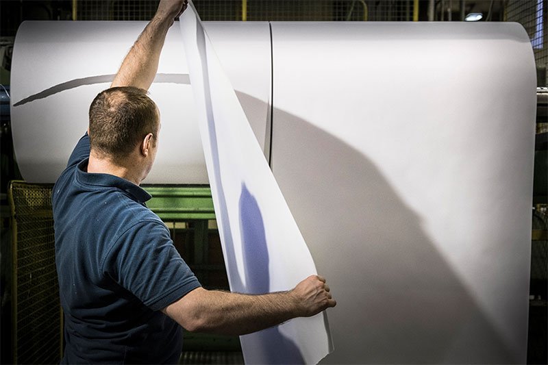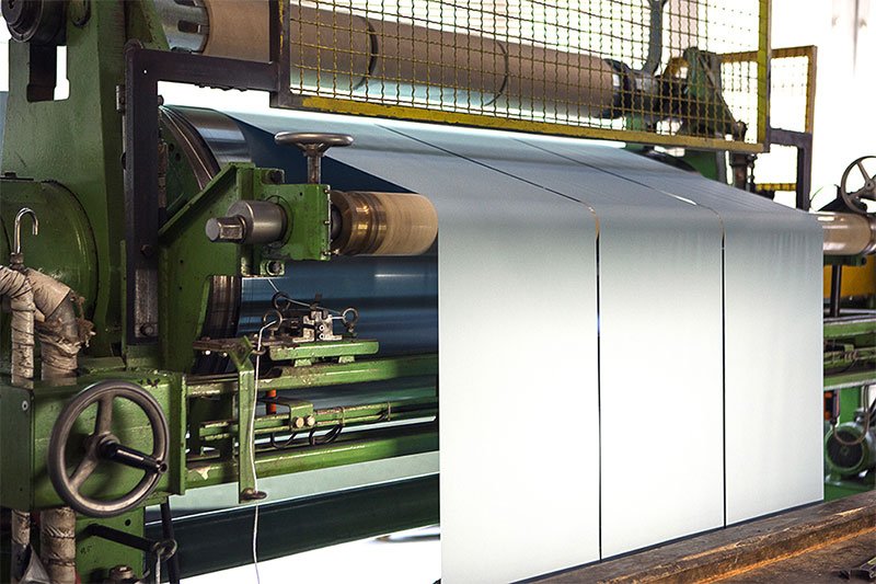 Ab hier unterschiedet sich die Herstellung von Leinenpapier von anderen Papiersorten: In einer speziellen Kalander-Anlage, die mit Prägewalzen ausgerüstet ist, wird die markante Leinenstruktur in das Papier geprägt. Dabei müssen Muster, Prägeformen, Druck und Hitze optimal aufeinander abgestimmt sein, um eine realistische Struktur und gleichzeitig ein stabiles Papier zu erzeugen.