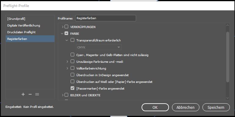 Schritt 3: Es öffnet sich das Fenster Preflight-Profile. Der Einfachheit wegen wird in diesem Beispiel ein extra Profil nur für die Suche nach Registerfarbe angelegt – natürlich können Sie diese Fehlersuche auch in bestehende Preflight-Profile integrieren. Um ein neues Profil anzulegen, klicken Sie auf das kleine Plus unter der Profil-Liste und benennen Sie das Profil. Anschließend deaktivieren Sie alle Häkchen, öffnen das Dropdown-Menü bei Farbe und setzen einen Haken bei [Passermarken]-Farbe angewendet. Anschließend bestätigen Sie mit OK.