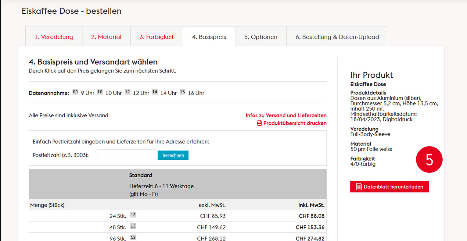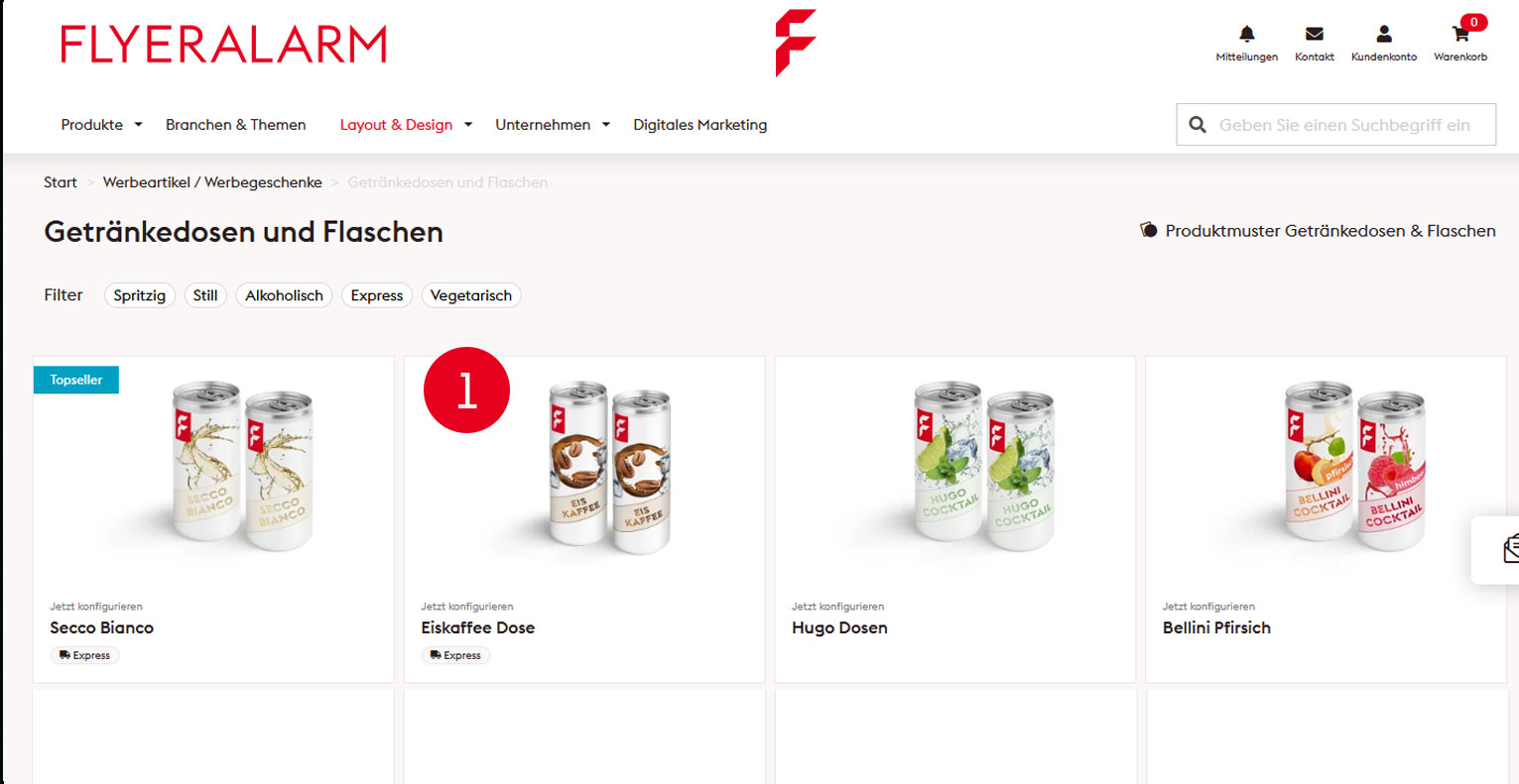 1 Gehen Sie auf flyeralarm.ch und suchen Sie das Produkt Getränkedosen. Entscheiden Sie sich für eine Sorte. Wir wählen die Eiskaffee Dose.