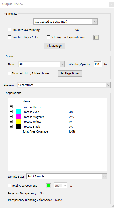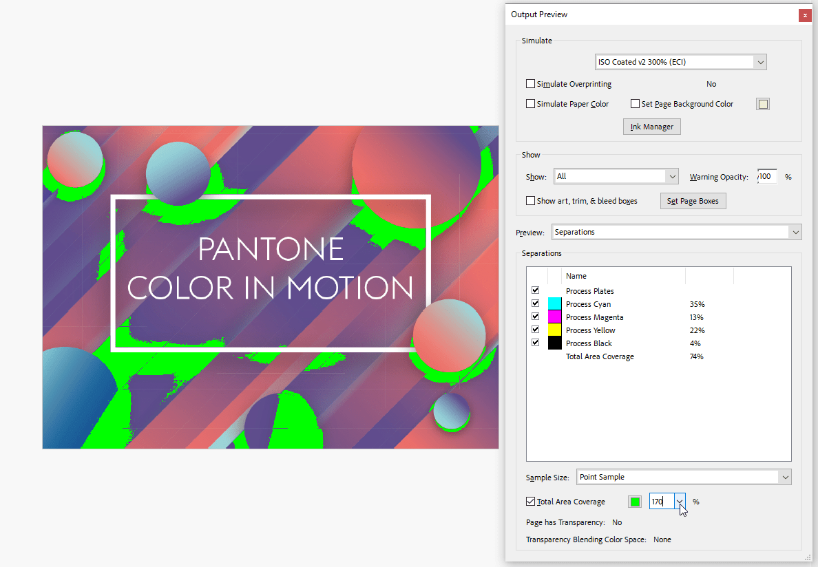 Trin 2: Som du kan se, er ingen positioner markeret grønne i skærmbilledet ovenfor. Derfor overstiger den samlede farvedækning ikke 300 % noget sted – layoutet ville derfor kunne printes uden problemer. For at illustrere dette er værdien i dette skærmbillede blevet reduceret til 170 %. Som du kan se, markerer Adobe Acrobat nu alle områder, hvor farvedækningen er over 170 %.