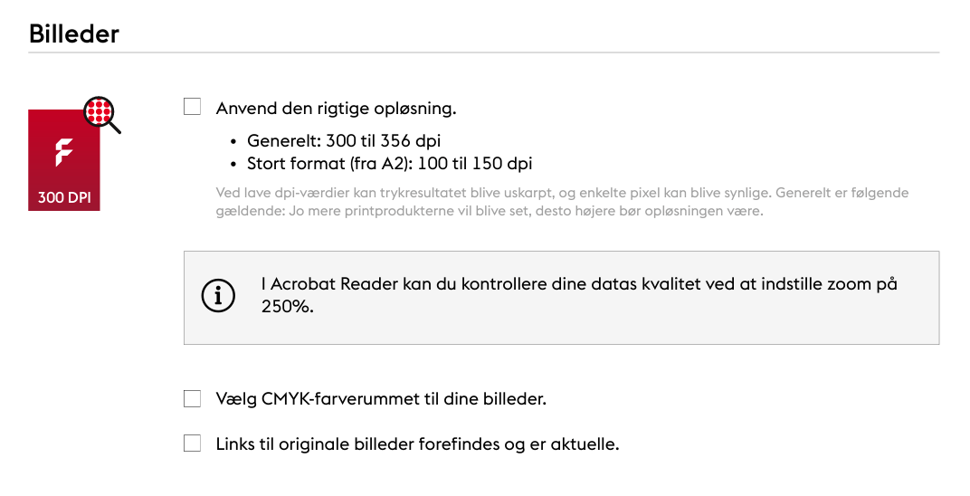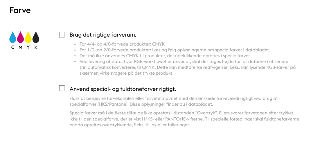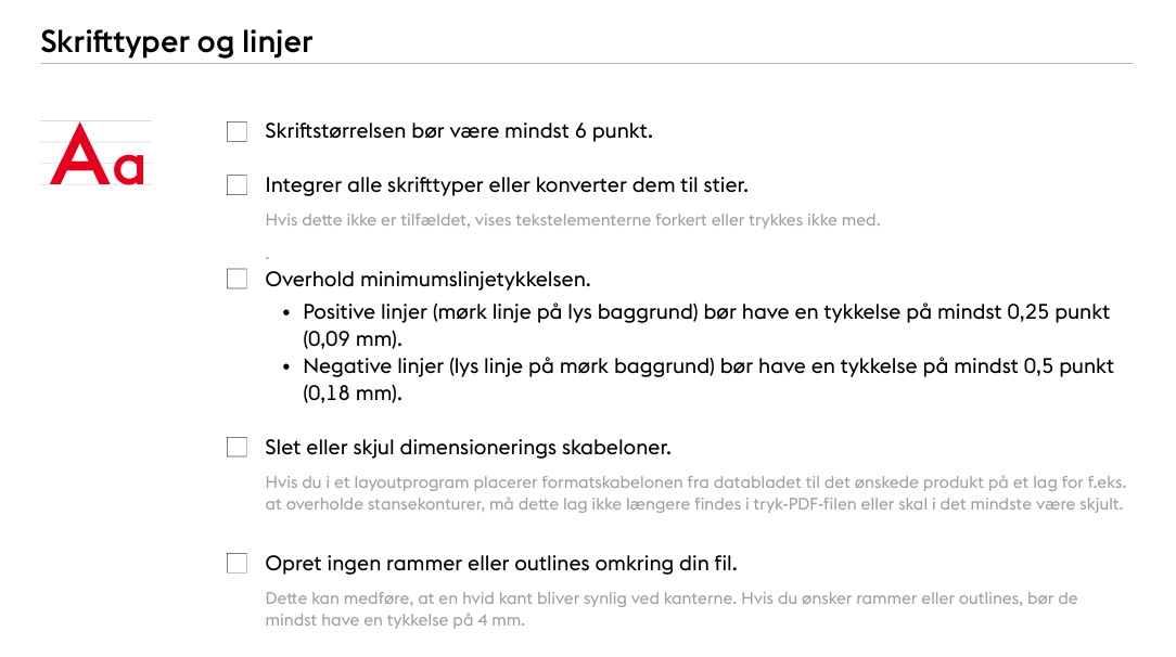 Der er meget at overveje, når man opretter trykdata. Denne tjekliste er en nyttig hjælp til at holde øje med de vigtigste punkter.