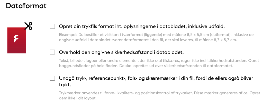 Er trykdataene oprettet i det korrekte dataformat? Er sikkerhedsmargenerne korrekte? Passer farverummet? Er spotfarverne defineret korrekt? Er opløsningen af billeder og grafik korrekt? Hvad med den overordnede farveapplikation? Hvilken PDF-standard kræver onlinetrykkeriet? Og er den korrekte farveprofil blevet brugt?