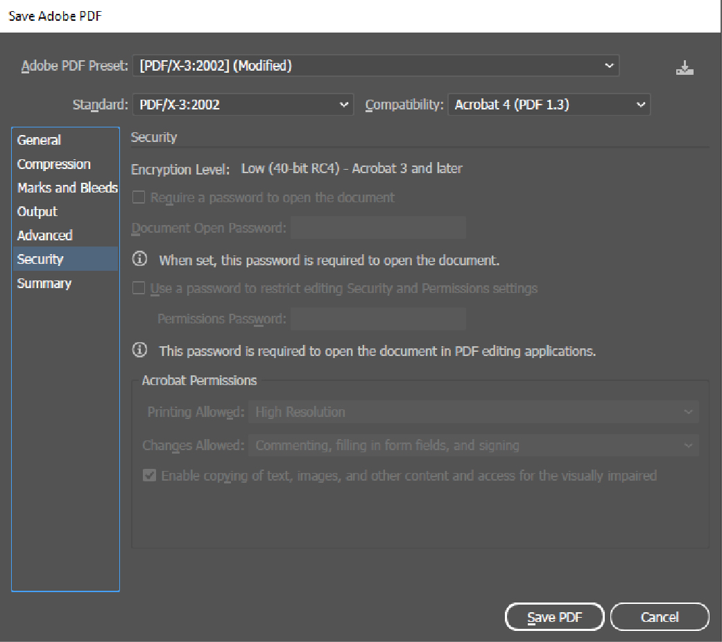 Hvis du valgte PDF/X-3:2002, skulle du ikke kunne indstille noget i denne kategori, og det er en god ting. For hvis der kræves en adgangskode for at åbne og/eller udskrive, kunne filen ikke behandles.