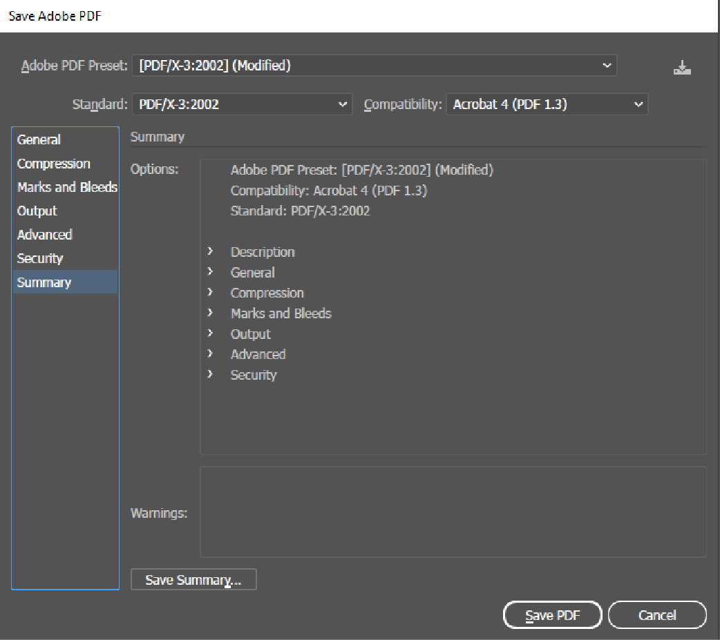 Når du er færdig med at designe dit produkt, skal du vælge Filer > Gem som i menuen. Giv din fil et navn i det vindue, der åbnes, og vælg “Adobe PDF” som filtype. Du kommer nu til eksportindstillingerne med følgende kategorier: