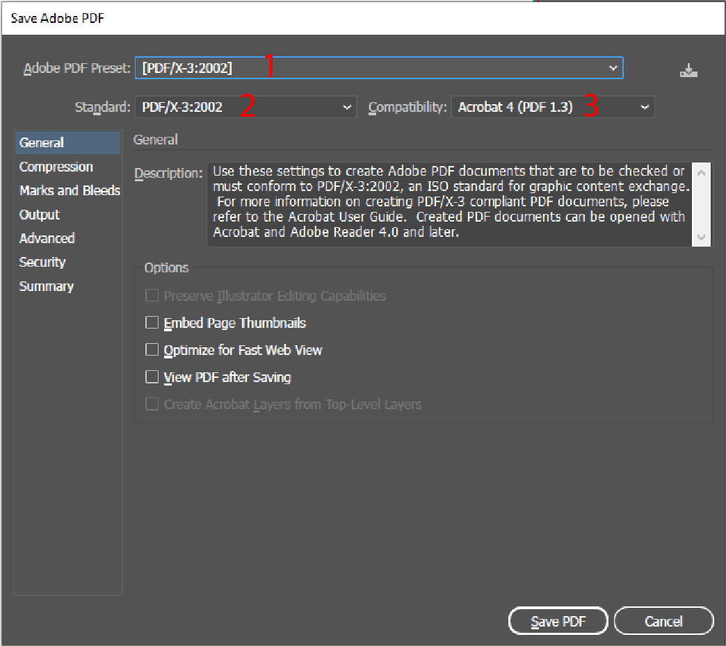 Vælg “PDF/X-3:2002” som Adobe PDF-forudindstillingen (1) og indstil “PDF/X-3:2002” (2) under Standard og “PDF 1.3” under Kompatibilitet (3).
