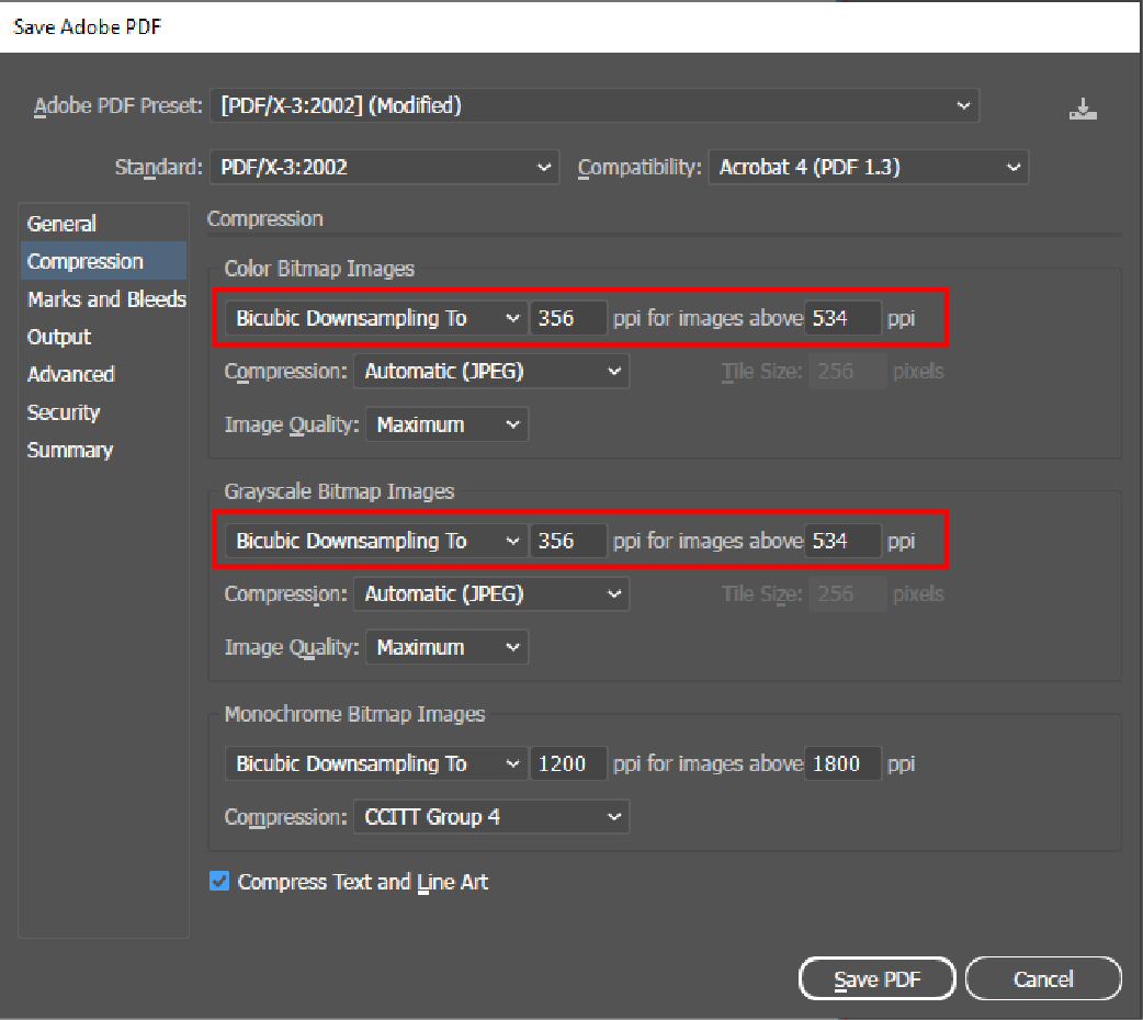 For farve- og gråtonebilleder skal du indstille bikubisk nedsampling til 356 ppi for billeder større end 450 ppi.