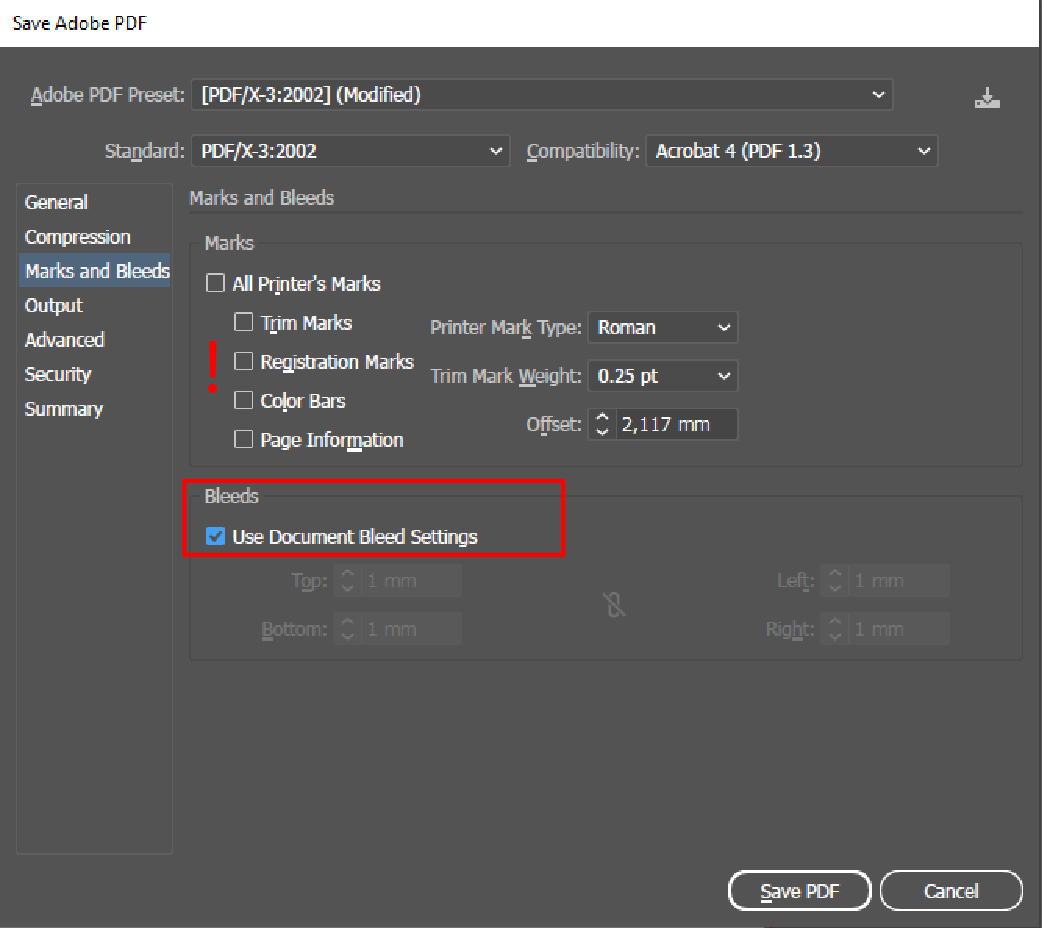 For at der kan tages højde for bleed under eksporten, skal du markere afkrydsningsfeltet “Brug dokumentudløbsindstillinger”. Sørg også for, at ingen af ​​mærkerne er aktiveret.