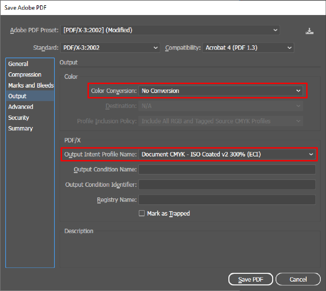Vælg “Ingen konvertering” for farvekonvertering, og kontroller, at “ISO Coated v2 300%” (for printprodukter) eller “ISO Coated v2” (for Storformat) er indstillet under Navn på outputmetodeprofilen. Baseret på forudindstillingerne i trin 1 bør den korrekte farveprofil dog allerede være valgt automatisk.