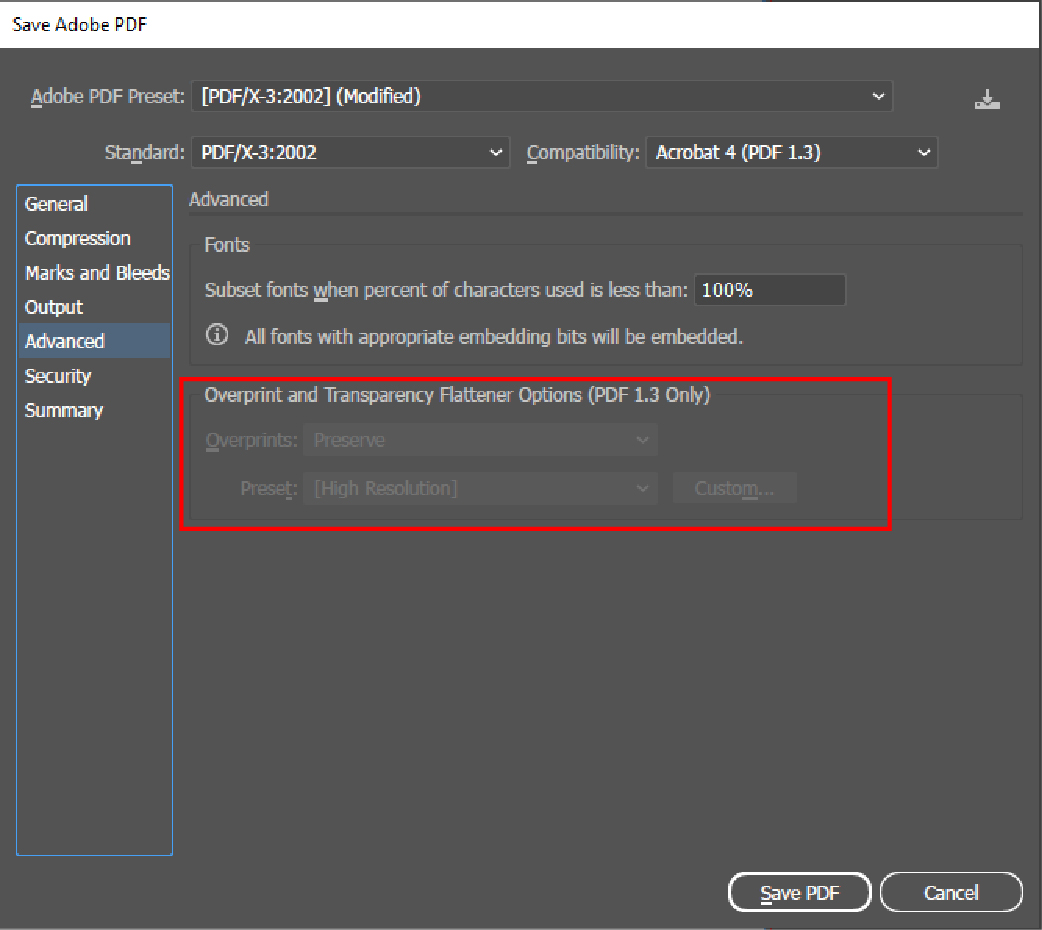 Hvis du vælger PDF-forudindstillingen “PDF/X-3:2002”, bør forudindstillingen Flatten Transparency allerede være indstillet til “Høj opløsning” og ikke kan tilpasses. Hvis du stadig kan vælge rullemenuen, skal du vælge “Høj opløsning” her.