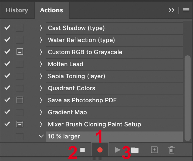 Then click on “Record”. The recording icon in the Actions pane appears in red (1). Repeat the steps above in the image size window and once you have completed the process, click the square stop icon (2). The action has now been recorded and can be executed as often as you want by clicking on the play icon (3) whenever necessary.