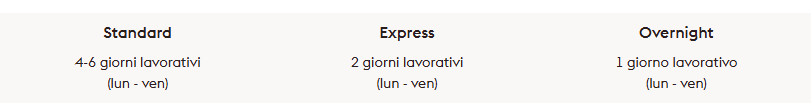 I prodotti vengono spediti del lunedì al venerdì, i nostri tempi di consegna sono di circa 3/4 giorni nel formato Standard. Per alcuni prodotti è disponibile anche la stampa rapida, chiamata Express e quella ultra rapida, chiamata Overnight.