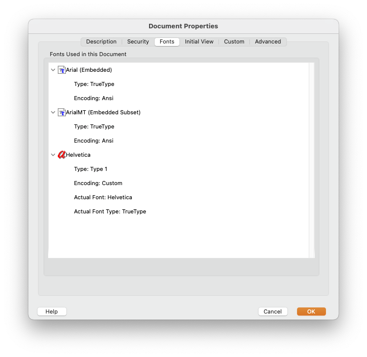 4) Verificate che tutti i font utilizzati siano correttamente incorporati. Se lo sono, accanto al nome del font troverete la dicitura “Incorporato” o “Embedded”.