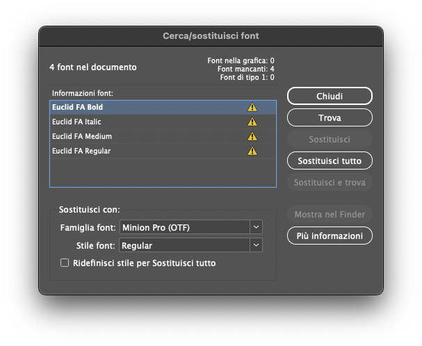 • Potete effettuare questo controllo dal menu “Testo” → “Trova font…”, dove InDesign mostra tutti i caratteri utilizzati nel documento.