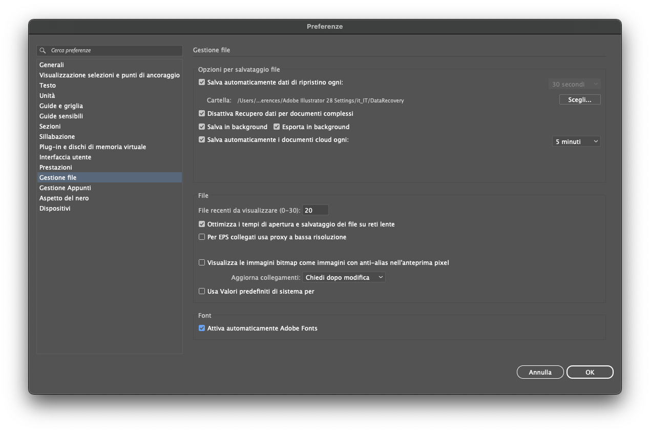 Anche in Adobe Illustrator i font provenienti da Adobe Fonts vengono incorporati automaticamente durante l’esportazione. Naturalmente, potete verificare che questa impostazione sia attiva: