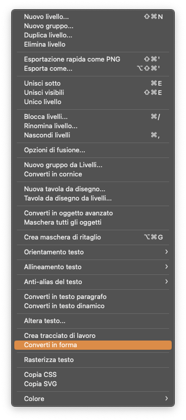 Fate clic con il tasto destro sul livello di testo e selezionate “Converti in forma”.