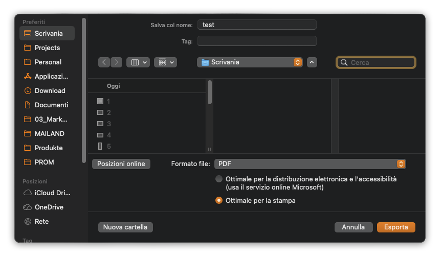 1) Per esportare un PDF, andate su File → Esporta e poi su Salva.