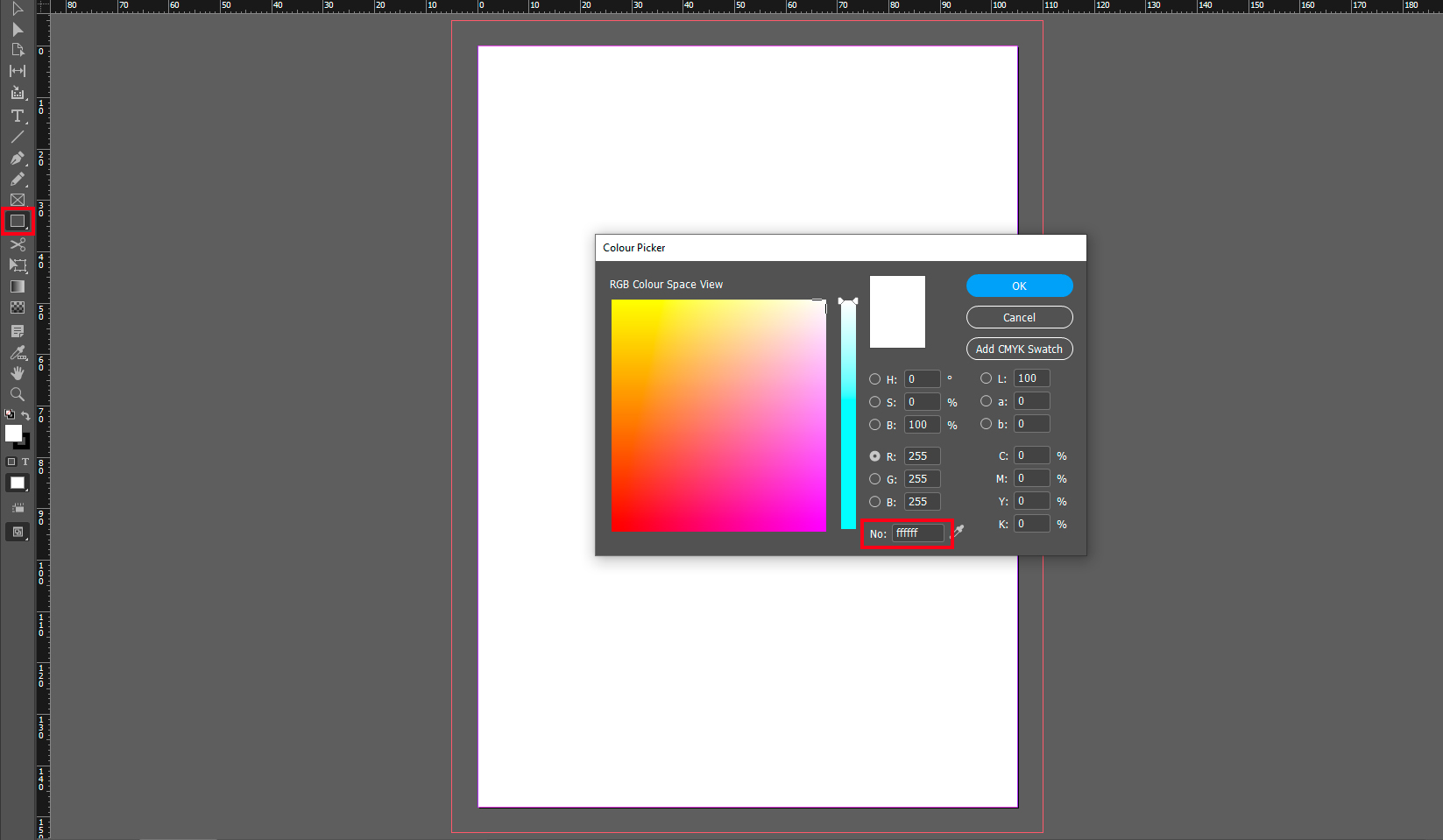 7. Välj rektangelverktyget från det vänstra verktygsfältet och dubbelklicka på fyllningsrutan för att ändra den till vit.