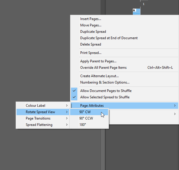 13. Högerklicka på sida 2 i panelen Sidor. Rotera nu spridningsvyn 90 grader under Sidattribut / Rotera spridningsvy / 90° CW.