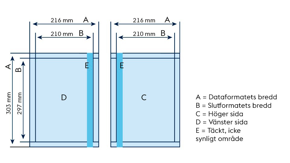 Det slutliga formatets bredd = 210 mm + 210 mm + 8 mm = 428 mm