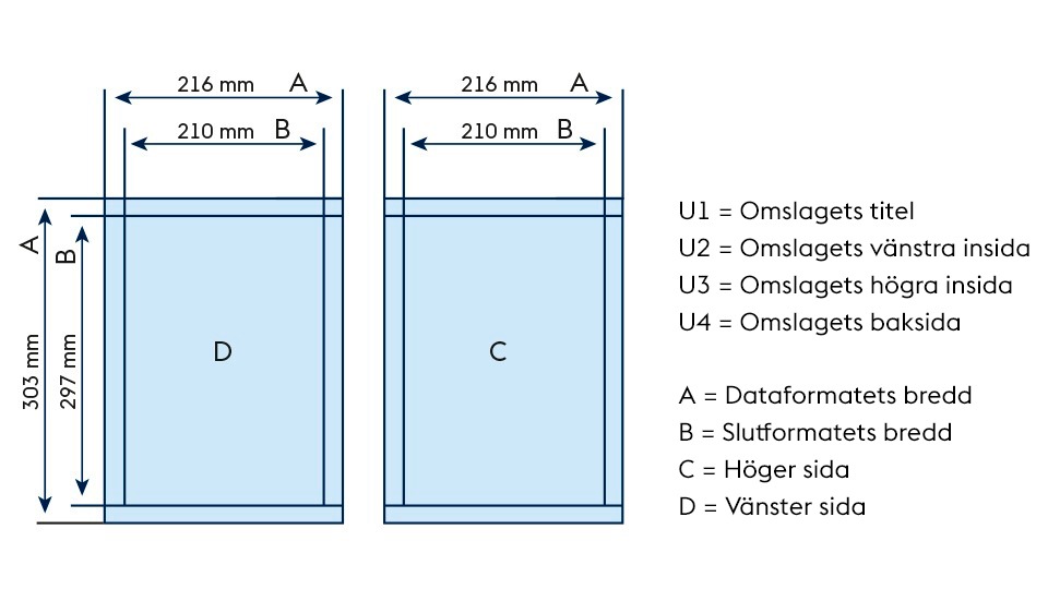 Omslagets format är därför 434 x 303 mm, där mitten 8 mm representerar ryggen. När du designar U2 och U3, var medveten om att ryggen inte kan ses här – logiskt sett är sidorna av den inre delen limmade här.