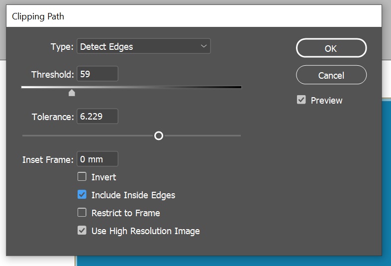 - Välj Objekt> Clipping Path> Options och här “Find edges”.
