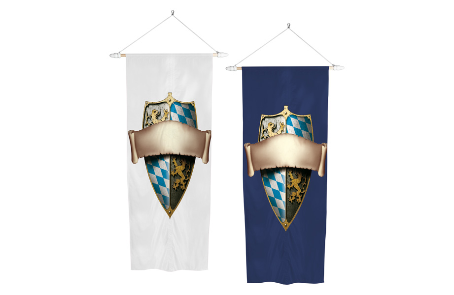 Bannerfahnen mit Hohlsaum oben, senkrechte Ringbandsicherung sowie eine Sturmsicherung unten. Im unteren Saum ist eine Gewichtskette (ca. 450 g) eingenäht.