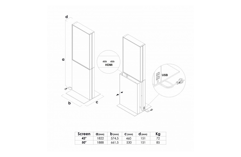 Gestell mit Stahlfuss und Aluminiumgehäuse mit zwei UHD Samsung-Bildschirmen inkl. Fernbedienung, Länge Stromkabel: 4 Meter, Anschlüsse: 2 x HDMI, 2 x USB, Funktionen: WLAN, Bluetooth, nur für den Innenbereich geeignet.