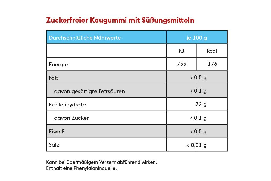 zuckerfreier Kaugummi Spearmint: Süssungsmittel (Isomalt, Sorbit, Maltitsirup, Xylit, Aspartam, Acesulfam K), Kaumasse (mit Antioxidationsmittel: stark tocopherolhaltige Extrakte), Feuchthaltemittel (Glycerin), natürliche Aromen, Verdickungsmittel (Gummi arabicum), Überzugsmittel (Carnaubawachs)