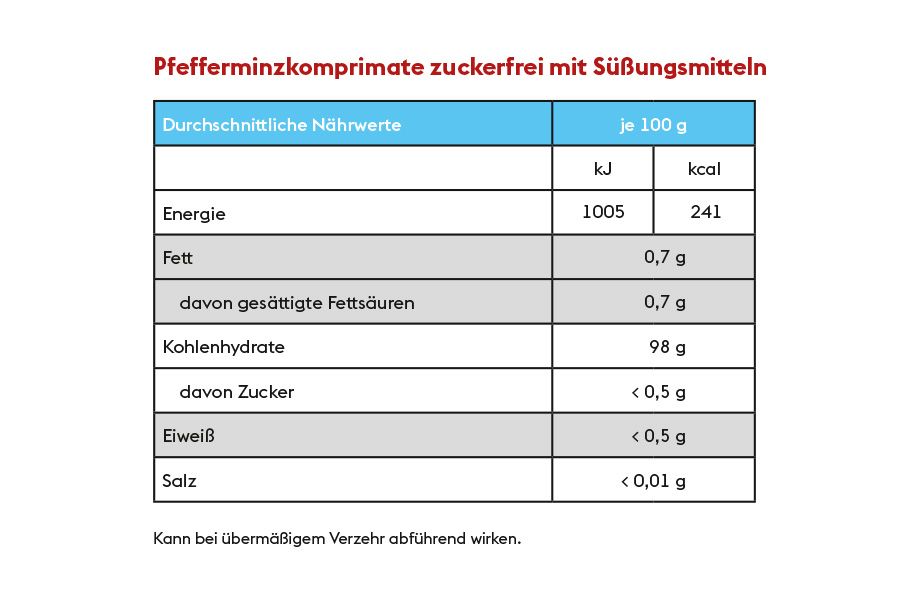 Pfefferminzpastillen zuckerfrei: Süssungsmittel (Sorbit), Trennmittel (Magnesiumsalze der Speisefettsäuren), Minzöl, Menthol, Süssungsmittel (Aspartam, Acesulfam K), Siliciumdioxid