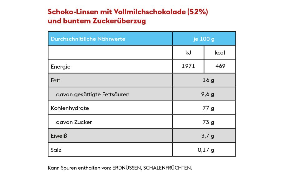 Schokolinsen: VOLLMILCHSCHOKOLADE (Zucker, Kakaobutter), VOLLMILCHPULVER, Kakaomasse, MOLKENPULVER, Emulgator: SOJALECITHIN, Natürliches Aroma), Geliermittel: Tapioka Stärke; Farbstoffe: E171, E120, E160, E163, E 141, E 100; Überzugsmittel: Carnaubawachs. Milchschokolade enthältmindestens 25 % Kakaobestandteile und mindestens 14 % Milchbestandteile. Kann Spuren von Nüssen, Erdnüssen und Gluten enthalten