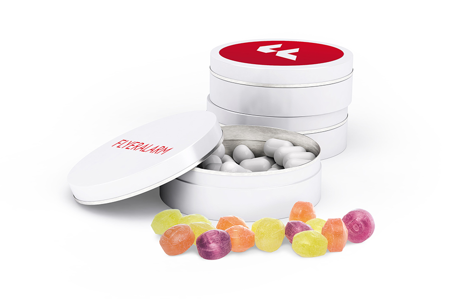 Die Mini-Bonbondosen passen in jede noch so kleine Tasche und sind ideal als kleine Erfrischung oder süsser Snack für unterwegs. Auch in Meetingräumen, auf Messen oder Events machen die Dosen als kleine Aufmerksamkeit eine gute Figur. Ihr Wunschmotiv oder Firmenlogo drucken Sie auf den Deckel. So bleiben Sie bei Geschäftskontakten oder der Kundschaft stets positiv im Gedächtnis.