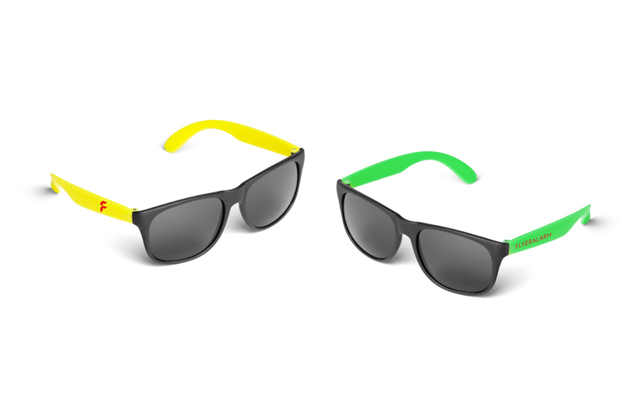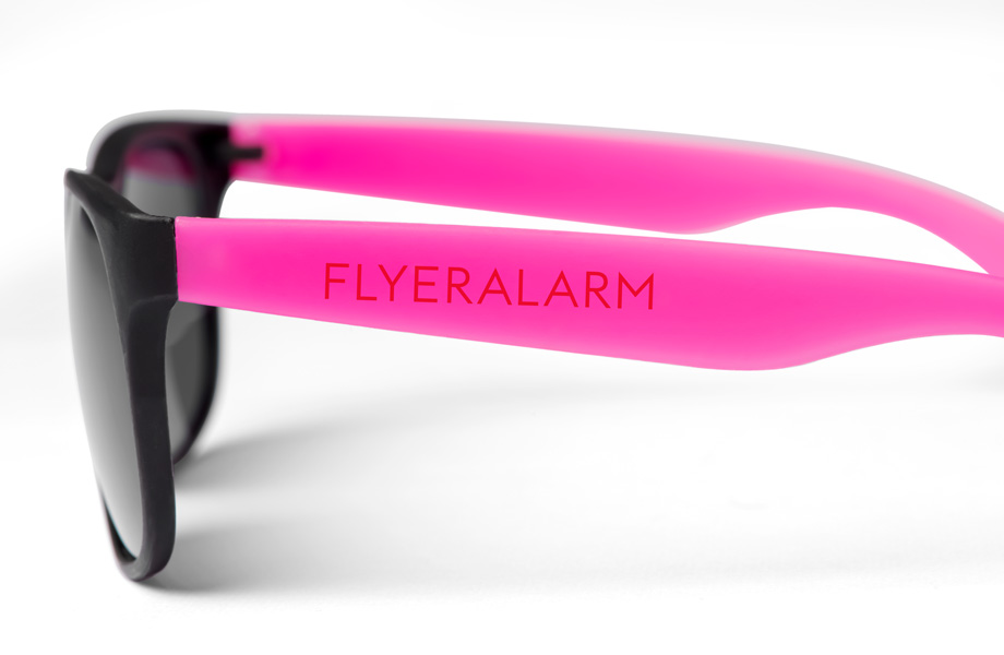 Vorne Schwarz, seitlich Neonfarben: So ausgerüstet kann der Sommer gerne kommen – und Sie sind mit Ihrer Marke auf allen Ausflügen mit dabei. Bedrucken Sie einfach diese coolen Sonnenbrillen im Neon-Look und der Werbespass im Freibad, am Baggersee, auf dem Rad oder beim Eisgenuss in der Stadt kann losgehen. Für einen sommerlichen Spruch und Ihr Logo ist auf den Bügeln genug Platz geboten.
