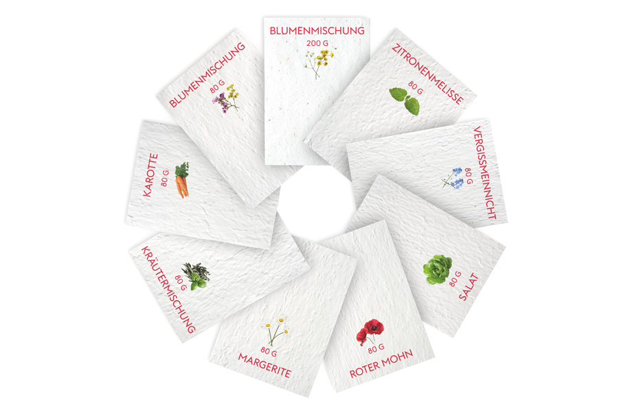 - 200 g Samenpapier (Blumenmischung) oder 80 g Samenpapier (Samenmischung, 8 verschiedene Samen wählbar)