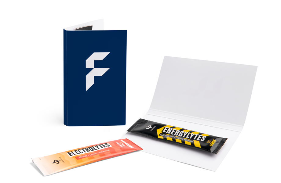 Karten, die wach machen: Diese Klappkarten kombinieren Werbebotschaft und Energykick in einem. Im Inneren steckt ein praktischer Stick mit Elektrolyte-Pulver – inklusive 160 mg Koffein, L-Tyrosin und wichtigen Mineralstoffen. Ob für Messen, Teamevents oder sportliche Zielgruppen: Diese Give Aways sorgen für viel Aufmerksamkeit und einen Energieschub zur richtigen Zeit.