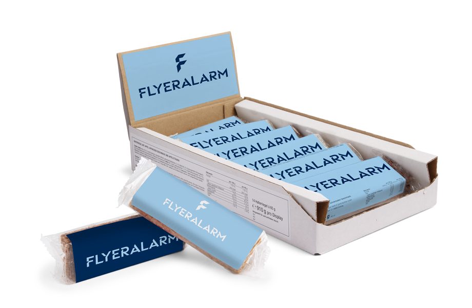 - Druckbereich: Riegel-Verpackung 11,6 x 7,1 cm, Display 14,6 x 7,6 cm