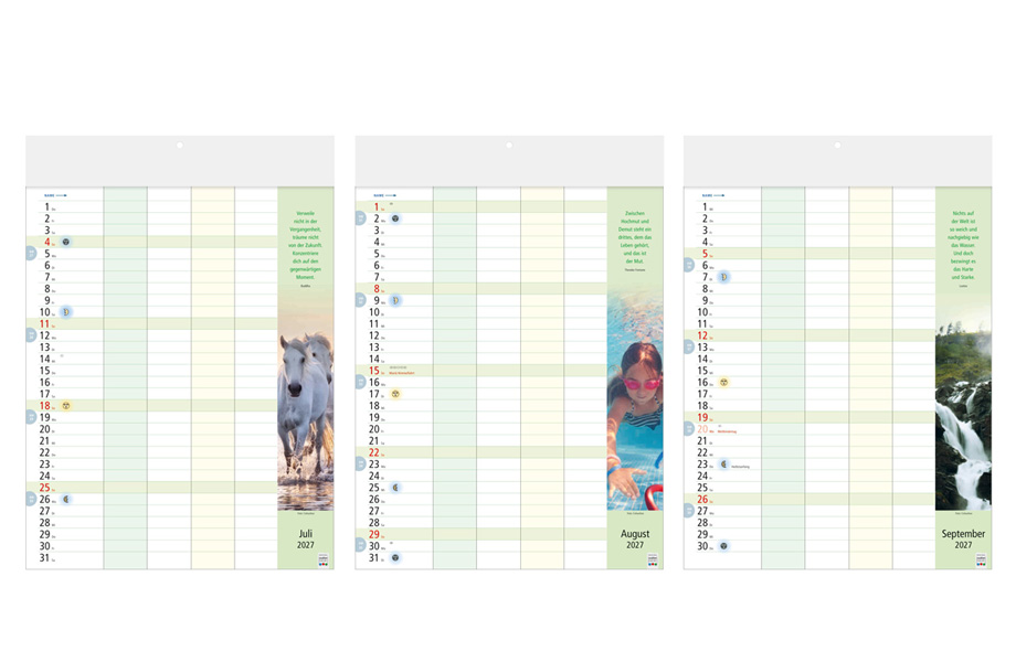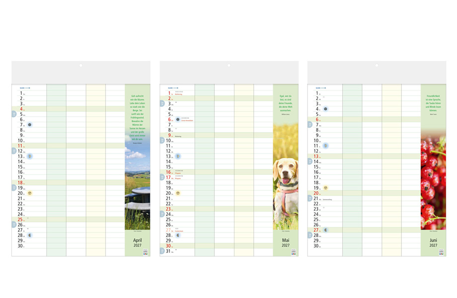 Ordnung für den Familienalltag – übersichtlich, praktisch und schön anzusehen: Der Wandkalender „Familienkalender“ bietet fünf Spalten für Termine, To-dos und Aktivitäten. So behalten alle den Überblick – vom Kindergeburtstag bis zum Elternabend. Dazu gibt’s jeden Monat ein neues, ansprechendes Fotomotiv. Das vorgefertigte Layout lässt sich ganz einfach mit Etiketten personalisieren – ideal als nützliches und sympathisches Werbegeschenk, als Willkommensgruß oder Thekenartikel für Familien.