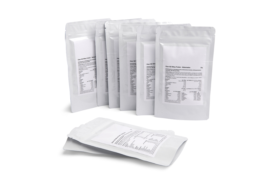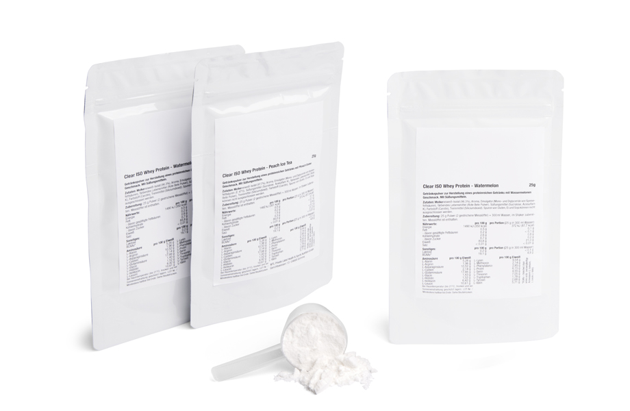 Leicht, fruchtig, klar – mit der Musterbox Whey Isoclear Pulver testen Sie, wie erfrischend Proteinpulver schmecken kann. Je zwei Beutel in vier erfrischenden Sorten sorgen für Abwechslung im Shaker: Brombeere, Wassermelone, Apfel und Pfirsich-Eistee. Ideal zum Probieren, Verschenken oder als Give Away für Fitnessstudios, Health-Brands und sportliche Messeauftritte.