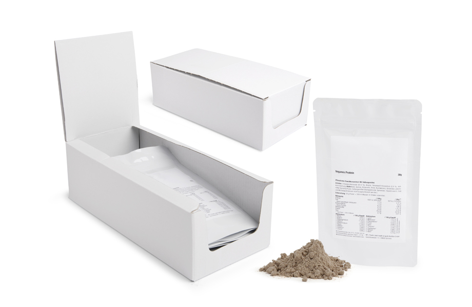 - Kartonbox mit veganem Proteinpulver-Proben