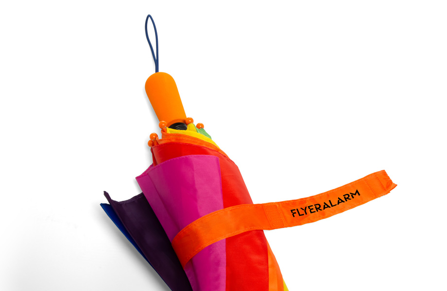 - Siebdruck auf Schirmdach (bis 3-farbig) oder Schließband (1-farbig)